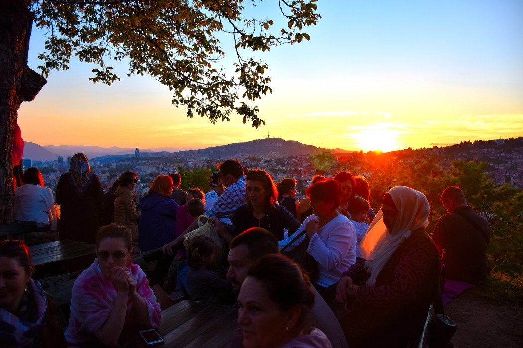 “You can see everyone is mixing so freely here to celebrate a Muslim festival, even if they are not Muslim or fasting themselves,” says Elmeddin. All around us groups of young and old sit together; tupperware is opened and home cooked food is passed around. Some have bought iftar on the way up and flip open takeaway boxes. Toddlers chase each other between the legs of chatting adults and the smell of a myriad dishes fills the air. Behind the green hills, the final lingering rays of the setting sun disappear as fairy lights atop the bastion come on. The day is done, but not for Ramadan in Sarajevo. Soon the tarawih (Ramadan night prayer) recitation will be heard all over town, followed by the buzz of locals socialising into the early hours. Ramadan is a truly magical experience in Sarajevo, the European capital city like no other.